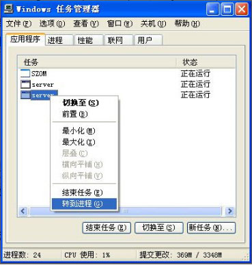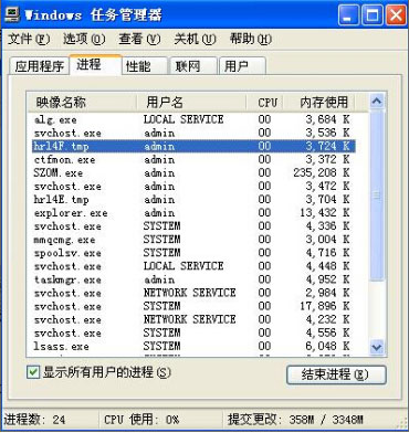 木馬程序或者病毒運(yùn)行而引起的窗口變小的情況,這時(shí)同時(shí)按住 Ctrl+Alt+Del鍵調(diào)出操作系統(tǒng)的“任務(wù)管理器”,我們會(huì)發(fā)現(xiàn)除了“SZOM”的軟件外還有其他的運(yùn)行程序。